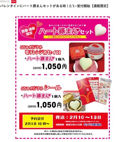 【551蓬莱】大阪名物 豚まん(肉まん)オンラインショップハート豚まんの受付は、2月1日開始予定です。: (shop-551horai.co.jp)