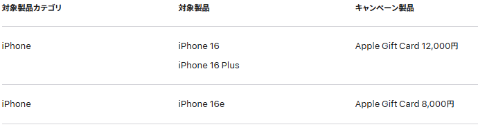 - iPhone 16e購入で 8,000円分のApple Gift Card還元