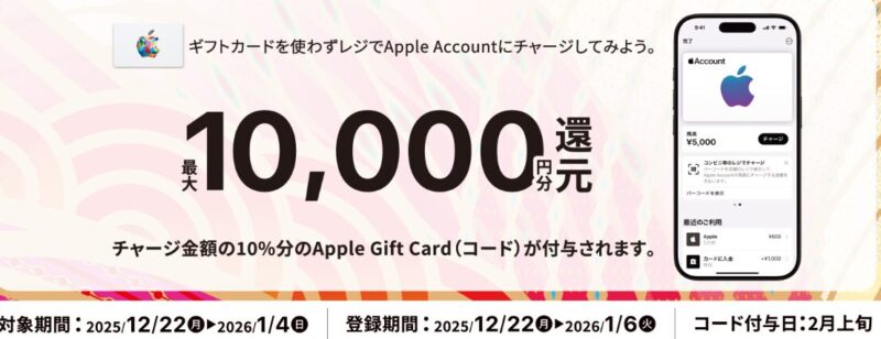 セブン‐イレブン、ローソン、ファミリーマート、ミニストップでは2025年12月22日から2026年1月4日まで、各店のレジでApple Accountに合計5000円以上チャージしたユーザー向けに、最大1万円分のApple Gift Card(コード)を還元するキャンペーンを開催する。