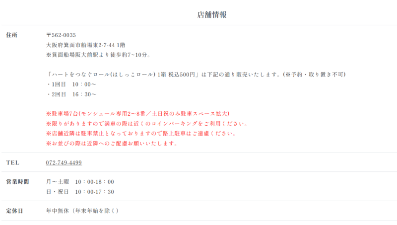 ※箕面船場阪大前駅より徒歩約7~10分。 - 「ハートをつなぐロール(はしっこロール) 1箱 税込500円」は下記の通り販売いたします。(※予約・取り置き不可)