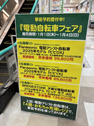 初売りに限らず、不定期で電動自転車を安く販売されているときがありますので、