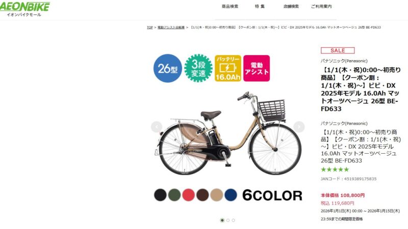 Panasonic電動自転車ビビDX 26型16.0Ah ¥119,680(税込)2026年1月