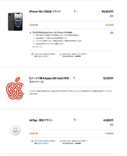 iPhone 16eを定価で購入しつつ、・AirTag・AppleCare+分のポイント還元を得られた